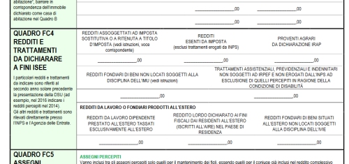 NUOVO MODELLO  DSU DISABILI – Nell’allegato A del decreto ministeriale si possono leggere le novità riguardanti il Quadro FC4 relativo ai Redditi e trattamenti da dichiarare ai fini ISEE. Qui si trova il riquadro per i trattamenti assistenziali, previdenziali e indenni tari non soggetti ad Irpef e non erogati dall’Inps, ad esclusione di quelli percepiti in ragione della condizione di disabilità.