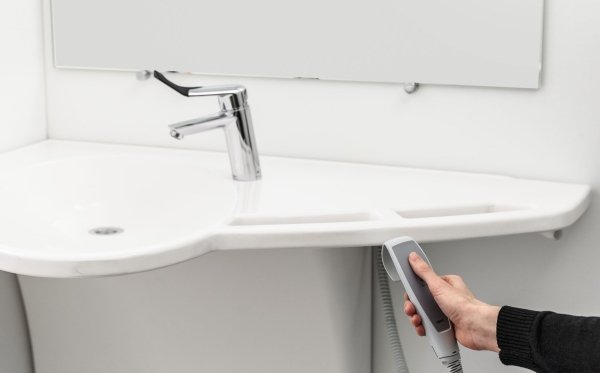 Il braccio applicato alla base permette infatti di gestirne la posizione e avere a portata di mano il lavandino anche in un punto più lontano dalla sua sede, come ad esempio mentre si è seduti sul wc.
