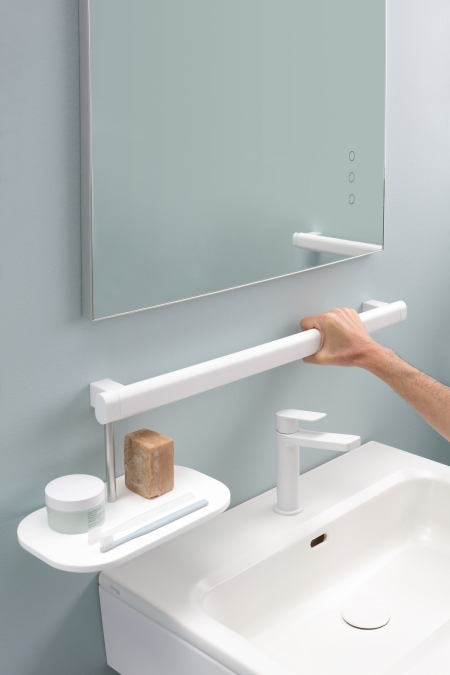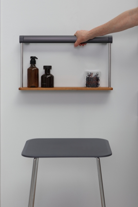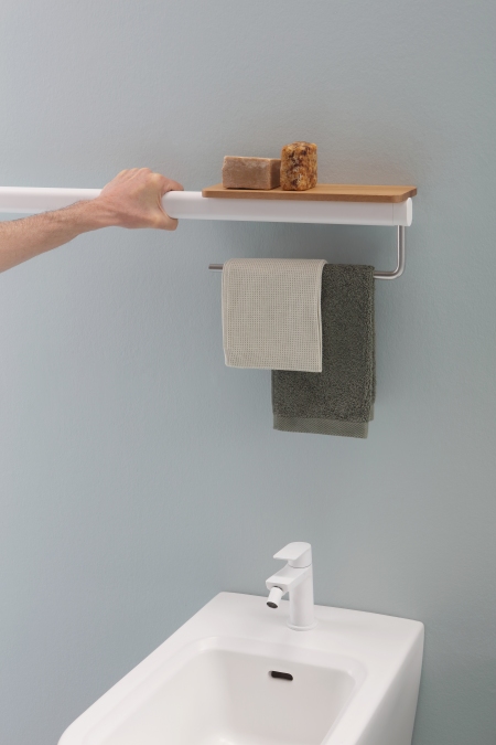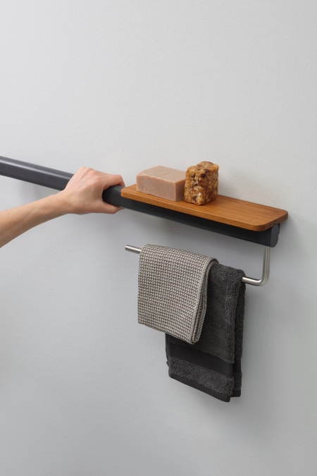 In questo modo, intorno all’“ausilio” maniglia costruiamo un sistema di arredo modulabile che può essere personalizzabile nel tempo, grazie alla applicabilità, anche a posteriori, di ciascun componente aggiuntivo.