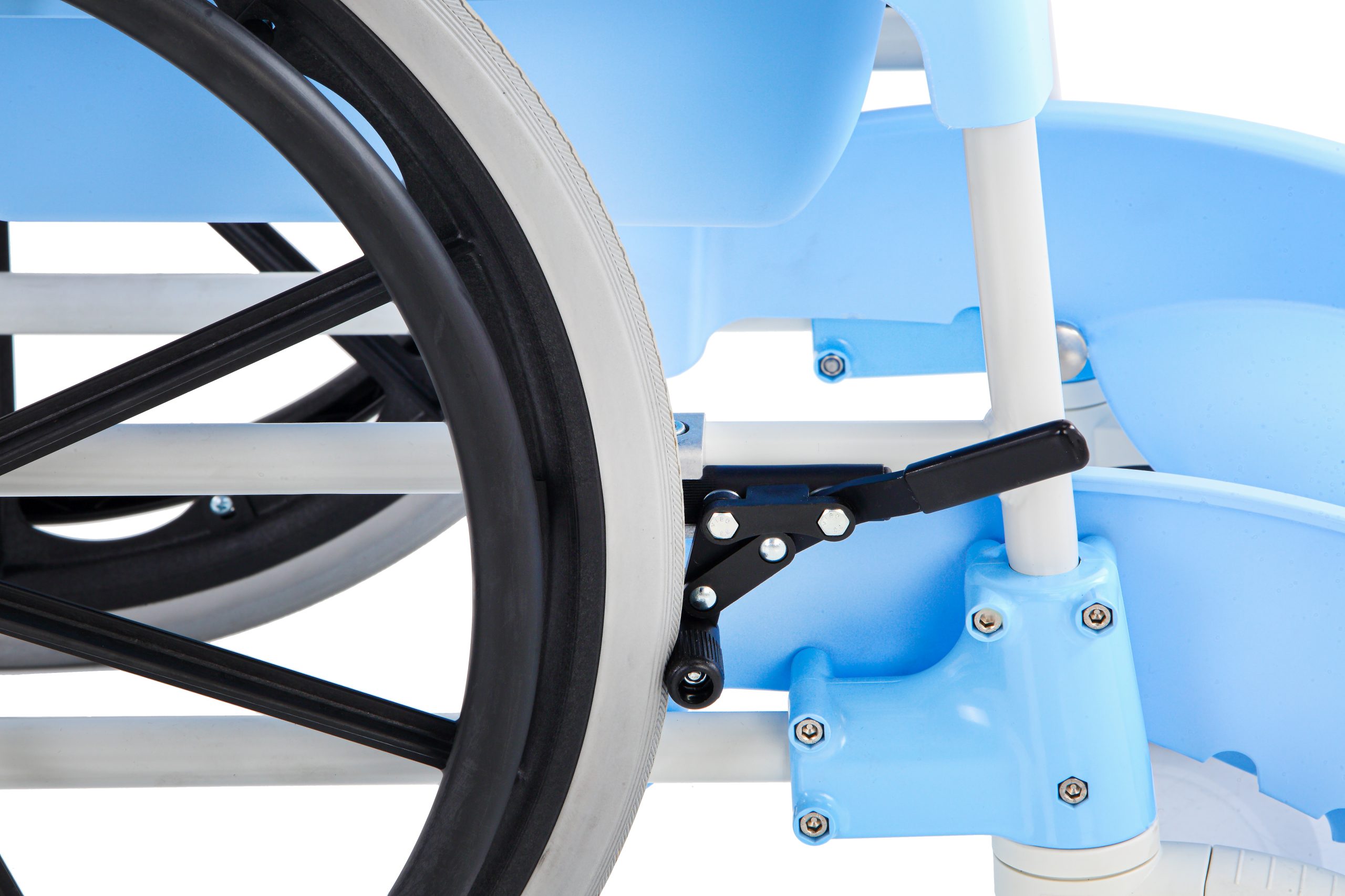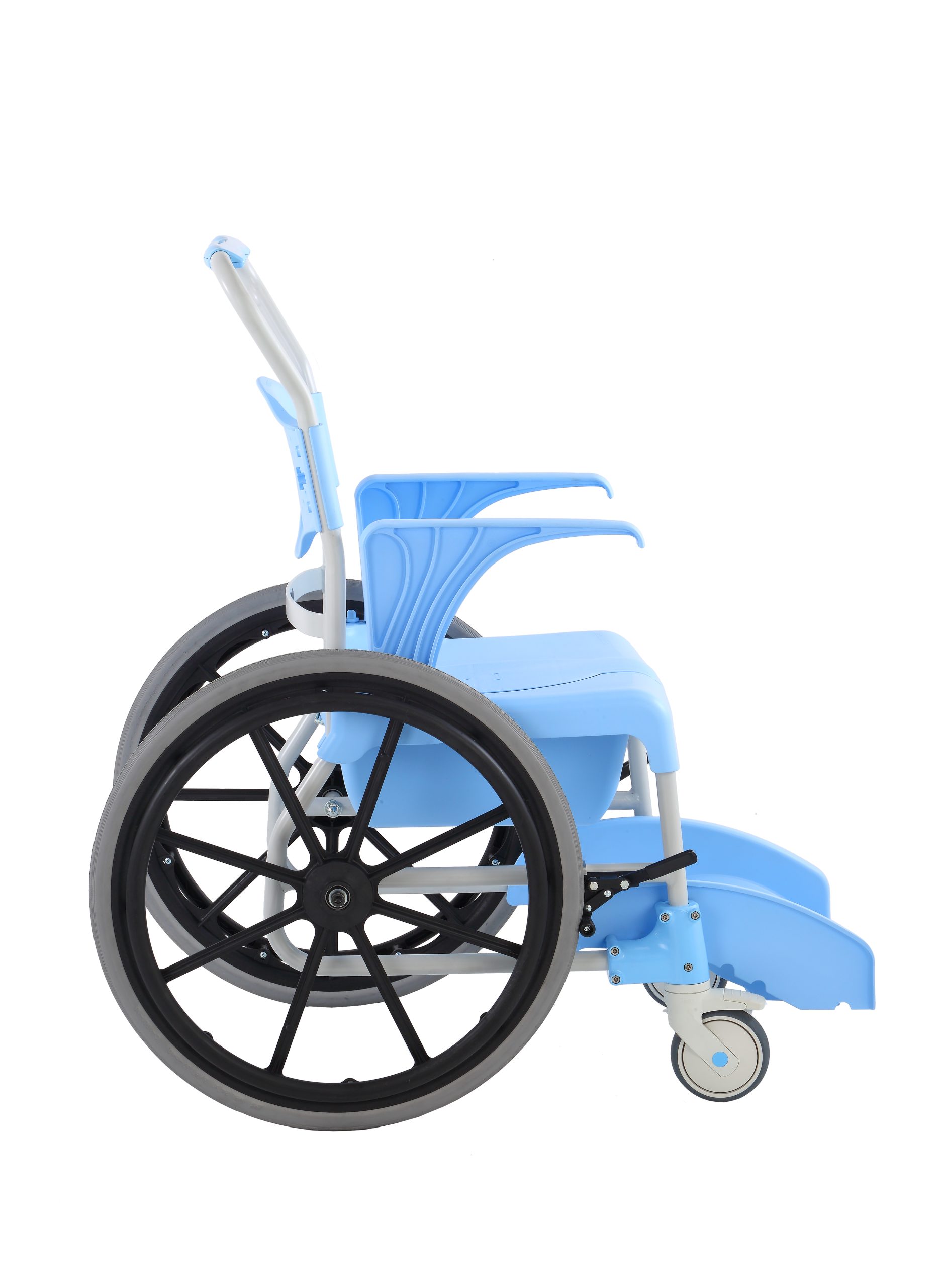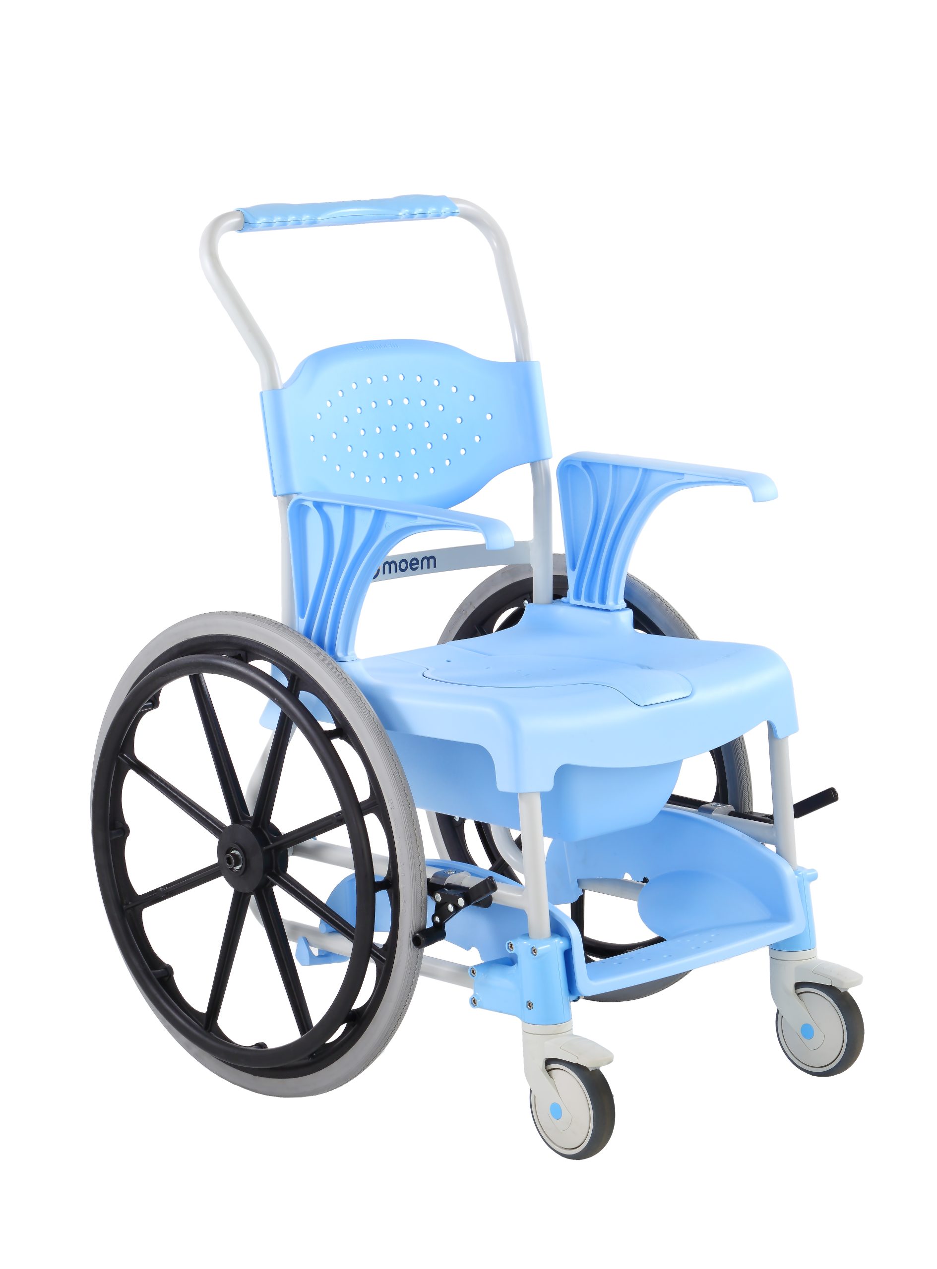 La sedia può essere comodamente usata come carrozzina da doccia per l’utente che non sia in grado di stare in piedi: i fori sullo schienale, sulla seduta e sul poggiapiedi presentano favoriscono il drenaggio dell’acqua e la pulizia.