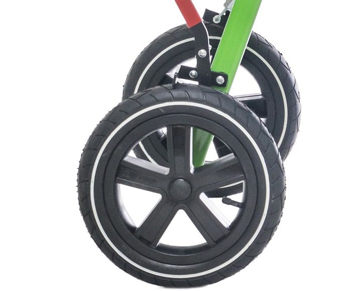 Le ruote anteriori sono piene e piroettanti, mentre quelle posteriori, pneumatiche e antiforatura, sono dotate di banda catarifrangente per la visibiltà nelle ore serali.