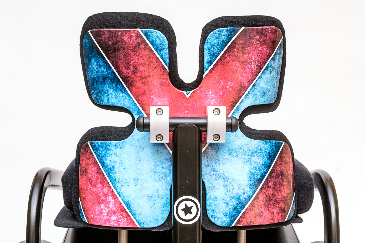 La seduta GO è munita di uno schienale di tipo ortopedico installato su supporto registrabile e reclinabile, di un cuscino realizzato in materiale idrorepellente e di un poggiapiedi contenitivo regolabile.