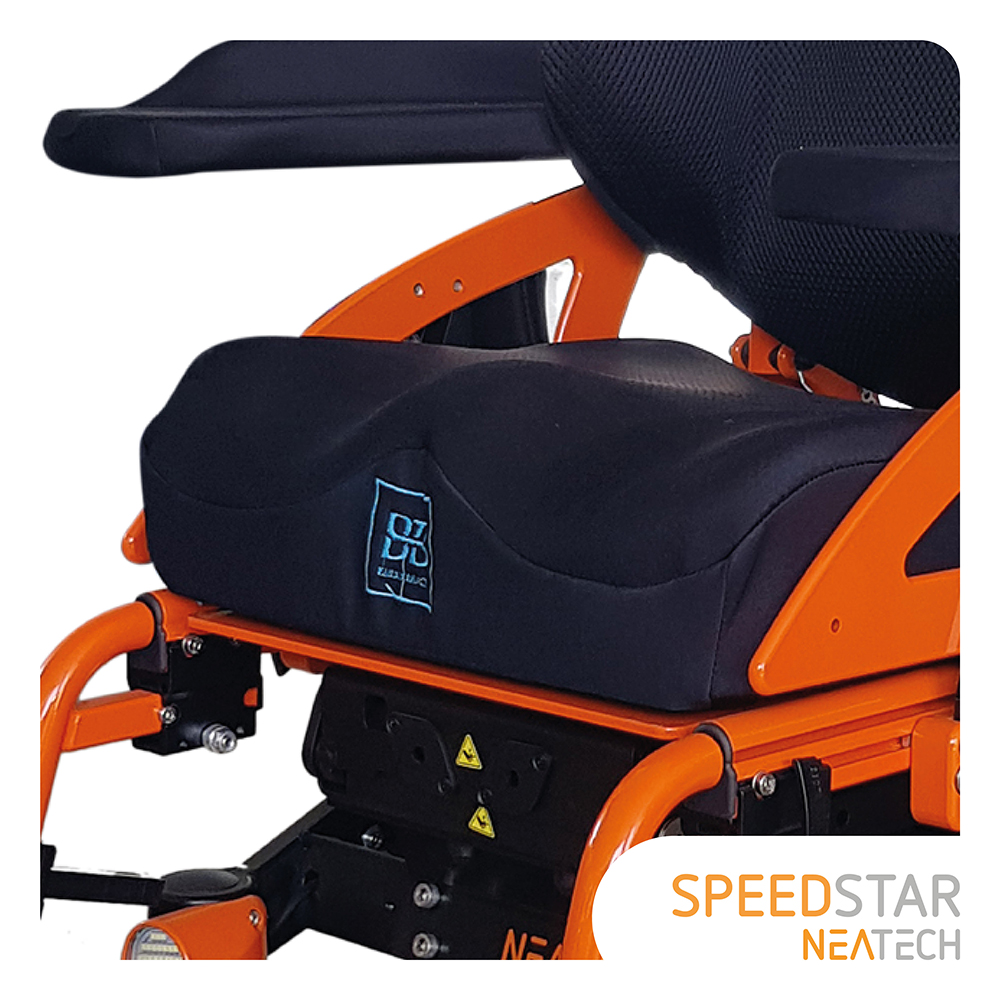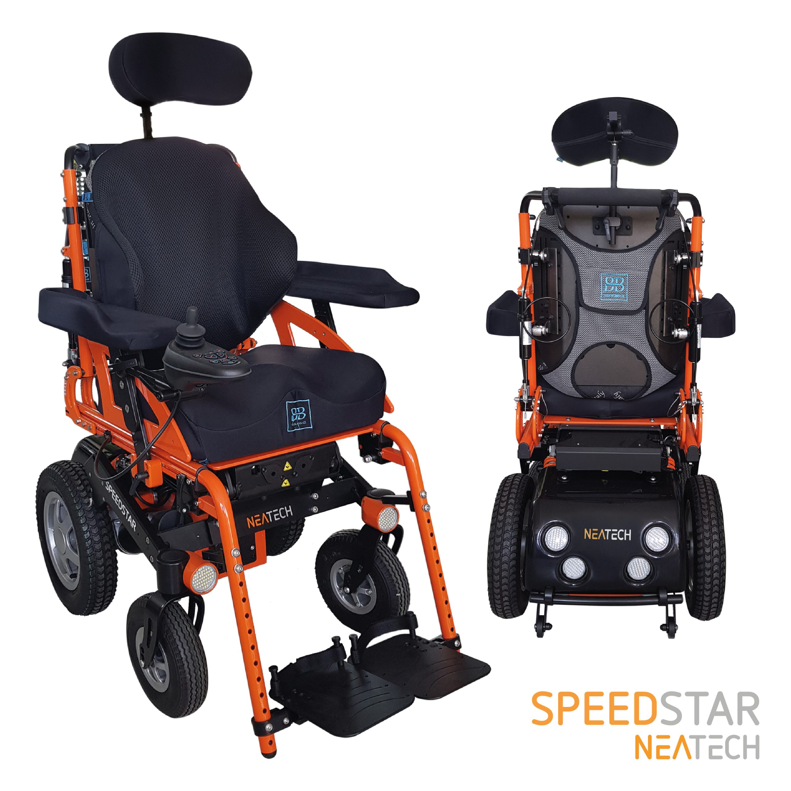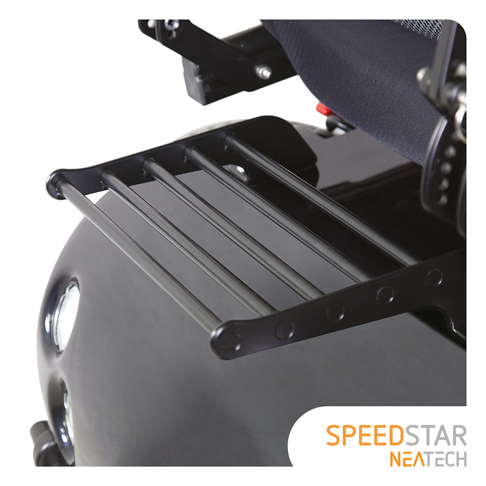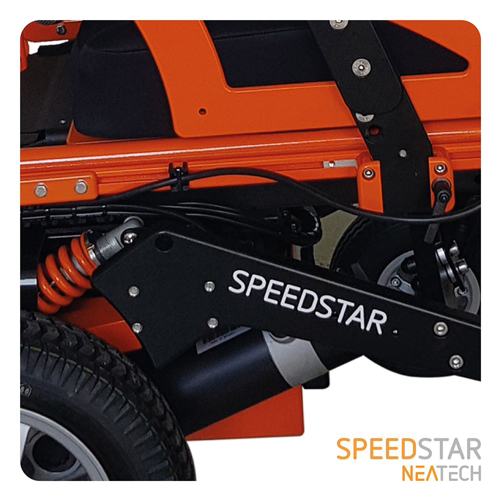 Speedstar di serie è dotata di un sistema di sospensione a bracci indipendenti e regolabili, di basculamento elettronico di 30° e può essere opzionalmente equipaggiata con schienale, poggiagambe e seduta regolabili elettricamente. La seduta può essere elevata fino a 300 mm così da offrire maggiore autonomia all’utente nella vita quotidiana.