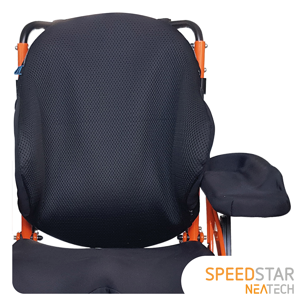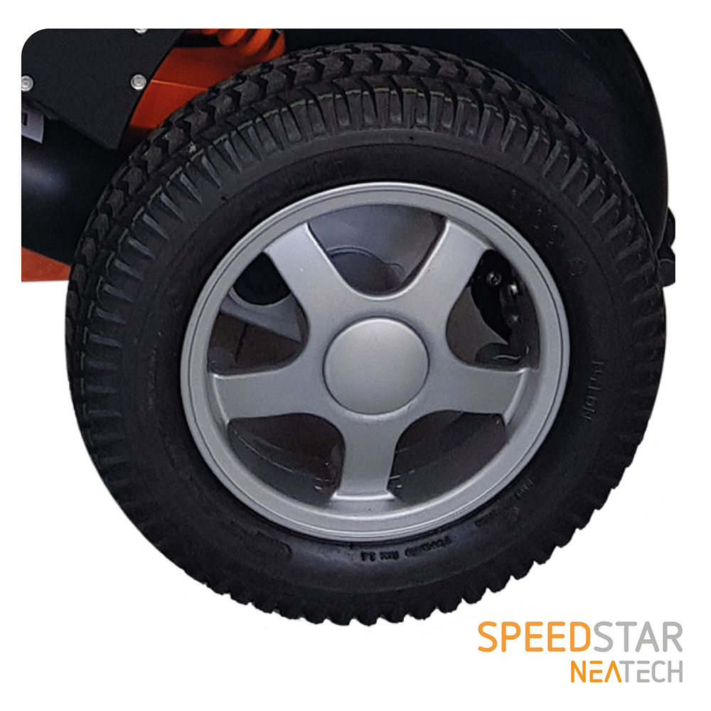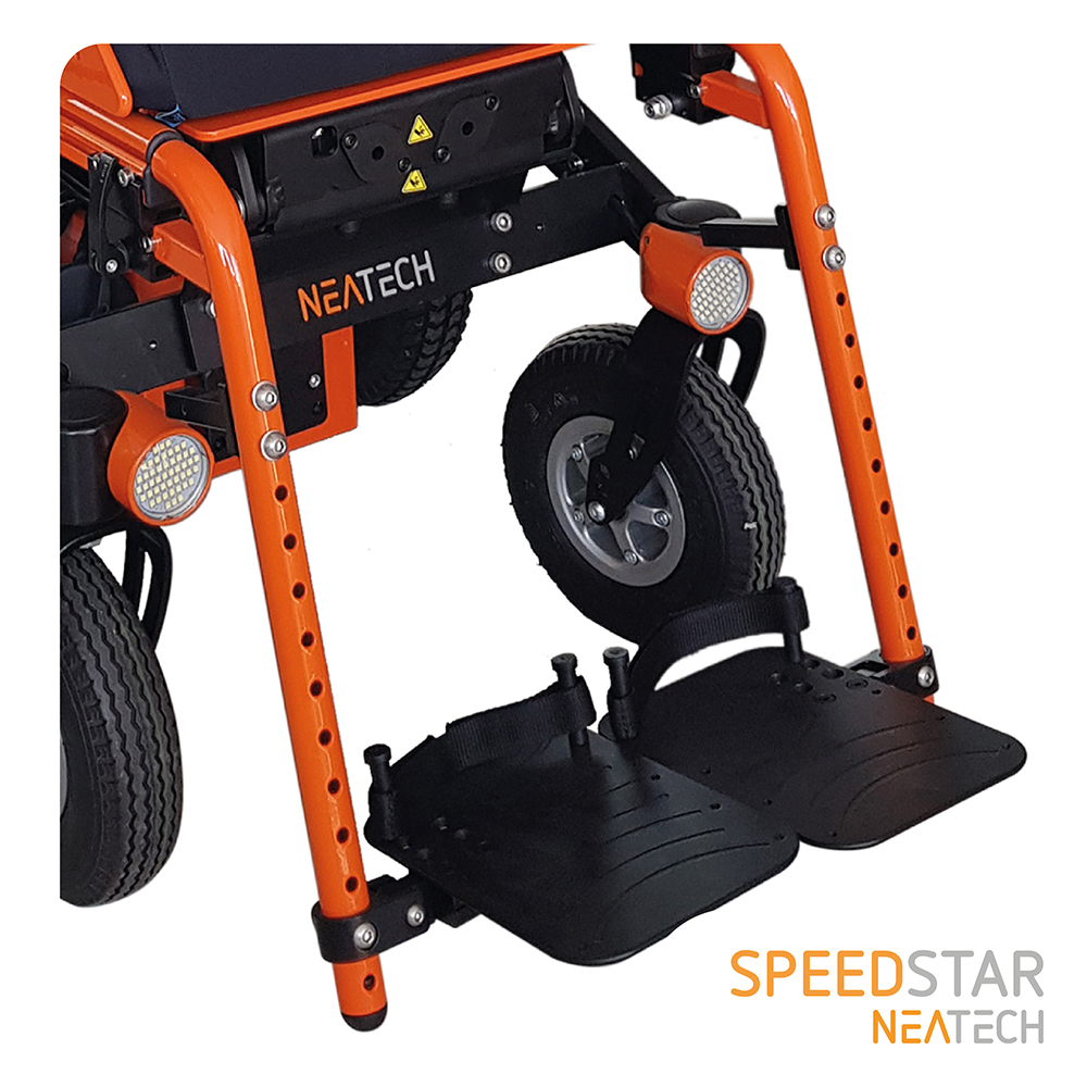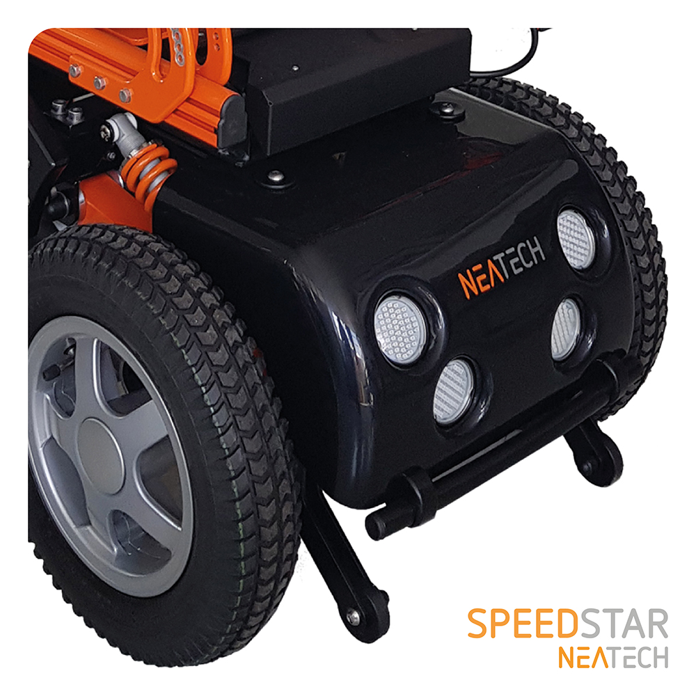 Speedstar di serie è dotata di un sistema di sospensione a bracci indipendenti e regolabili, di basculamento elettronico di 30° e può essere opzionalmente equipaggiata con schienale, poggiagambe e seduta regolabili elettricamente. La seduta può essere elevata fino a 300 mm così da offrire maggiore autonomia all’utente nella vita quotidiana.