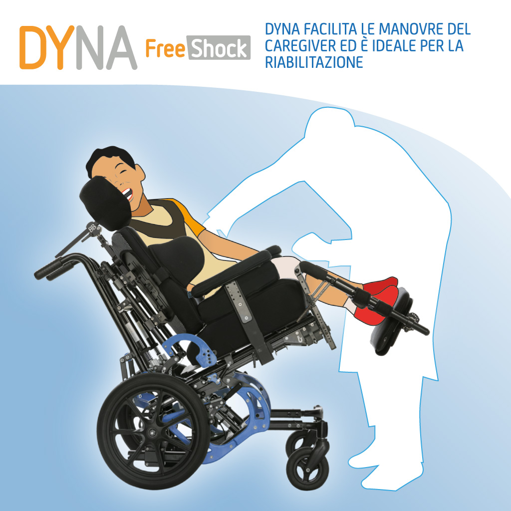 Il basculamento di 45° facilita le manovre del caregiver (attività riabilitativa, trasferimento sul letto, ecc) migliorando la qualità dell’assistenza medica e personale offerta all’utente. DYNA unitamente ai sistemi posturali Buddy Brace, ergonomici e traspiranti, riduce notevolmente il rischio di piaghe da decubito e di altre complicanze legate ad una postura errata.
