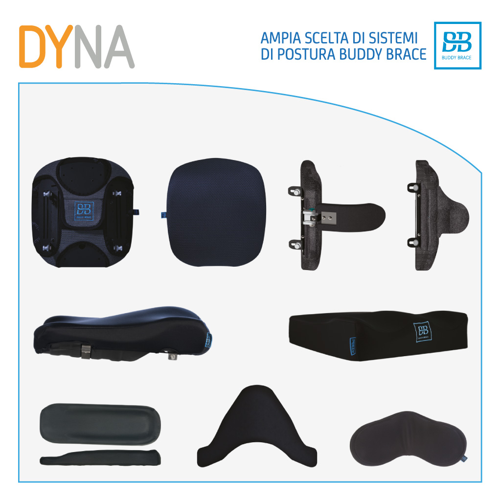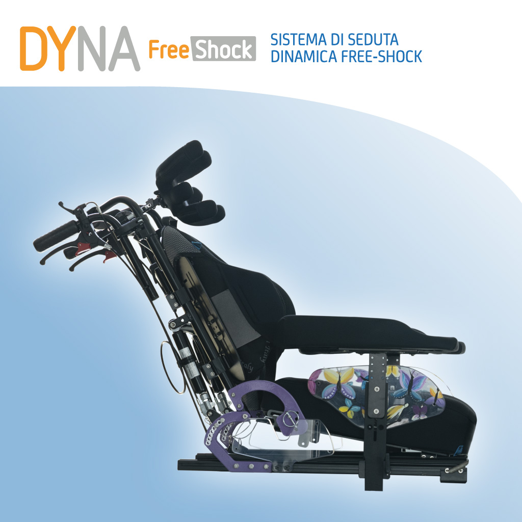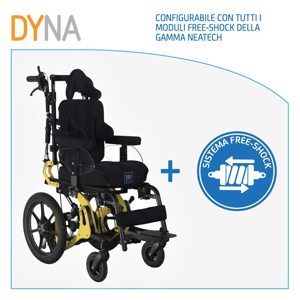 DYNA configurata con tutti i moduli free-shock della gamma Neatech rappresenta una valida soluzione posturale per le problematiche associate a disordini del movimento e in particolare per utenti con distonia a carattere estensorio.