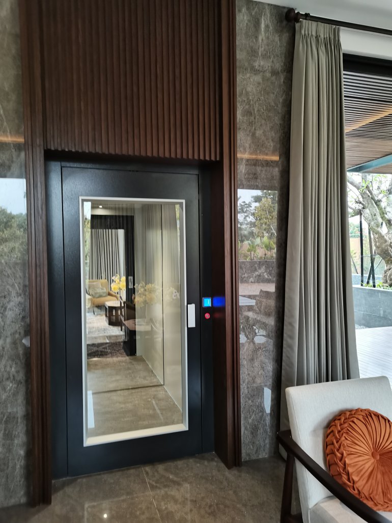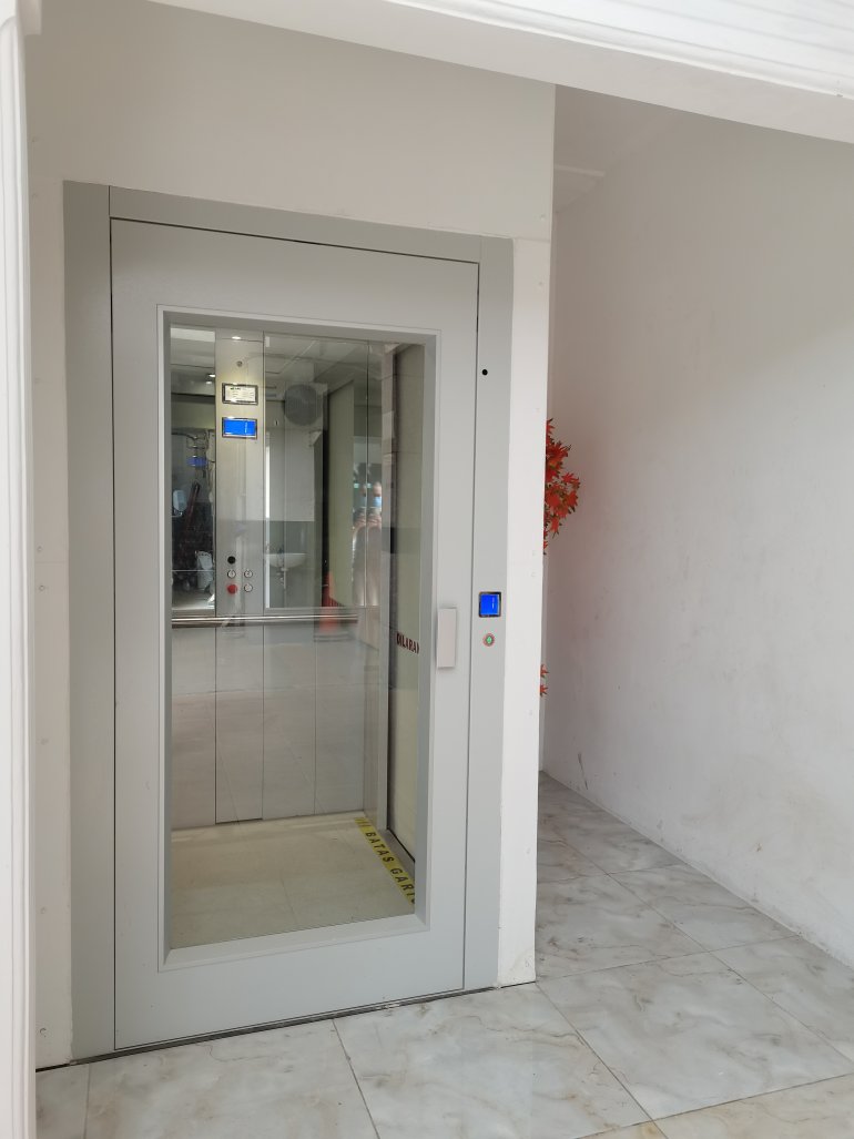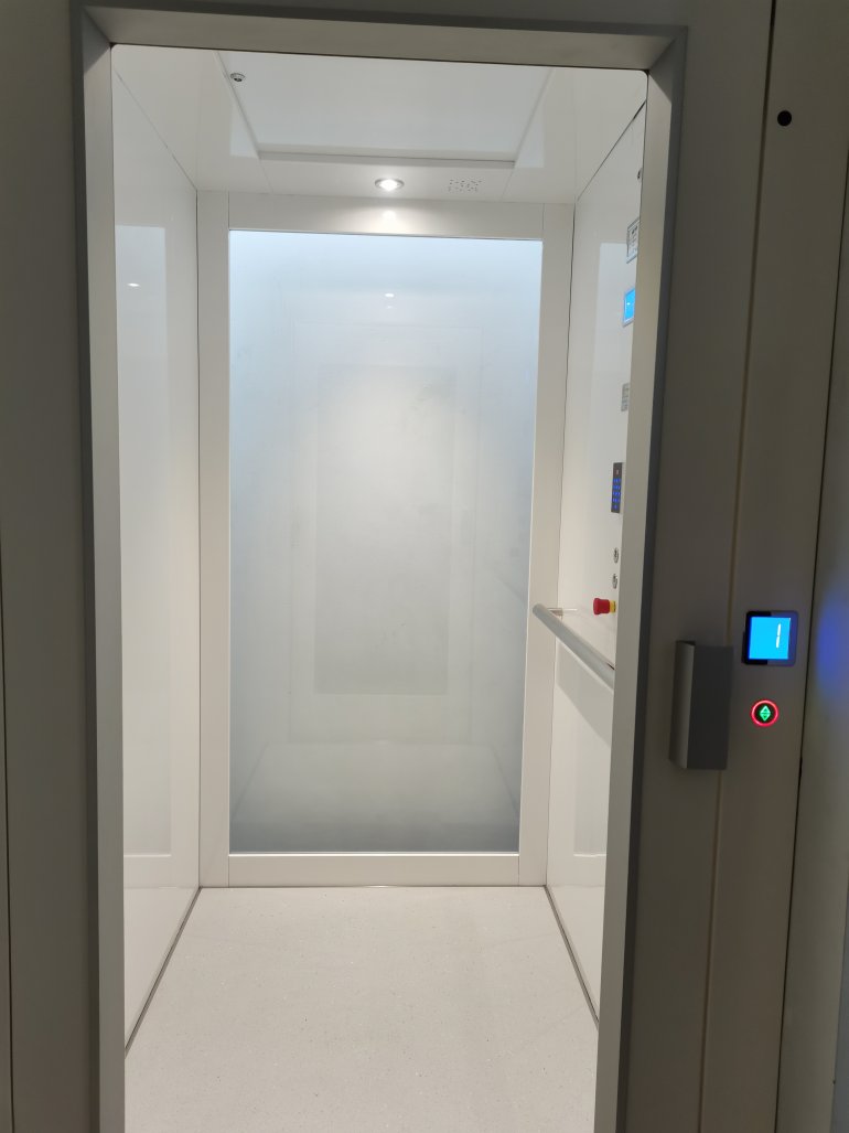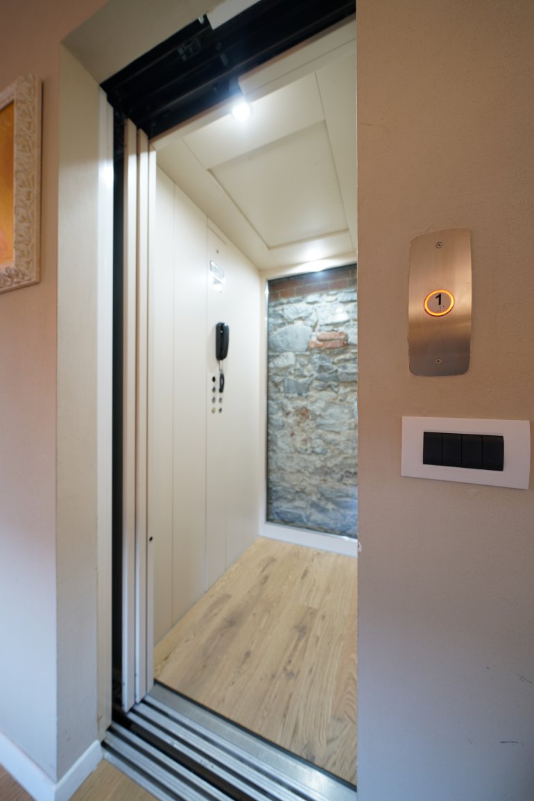 Oltre a personalizzare le porte della cabina, è possibile scegliere anche i materiali del pavimento e delle pareti del miniascensore per interni. Per un allestimento molto attuale che si integra con l’edificio, è disponibile l’opzione per pareti “total glass”, o il vetro con intelaiatura in acciaio. La porta, il pavimento e la parete sul fondo possono essere realizzati in materiali diversi in armonia con lo stile interno. Anche per questa versione sono a disposizione diverse combinazioni di finiture di cielino, bottoniera e maniglia delle porte a battente.
