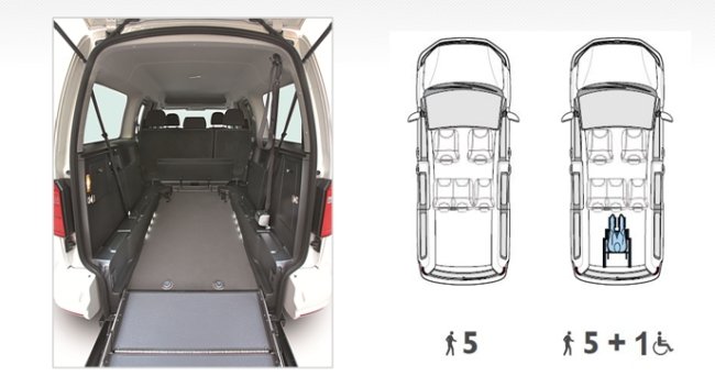 Volkswagen Caddy (7 posti oppure 5 posti + 1 carrozzina) con piano ribassato e rampa per accesso carrozzina